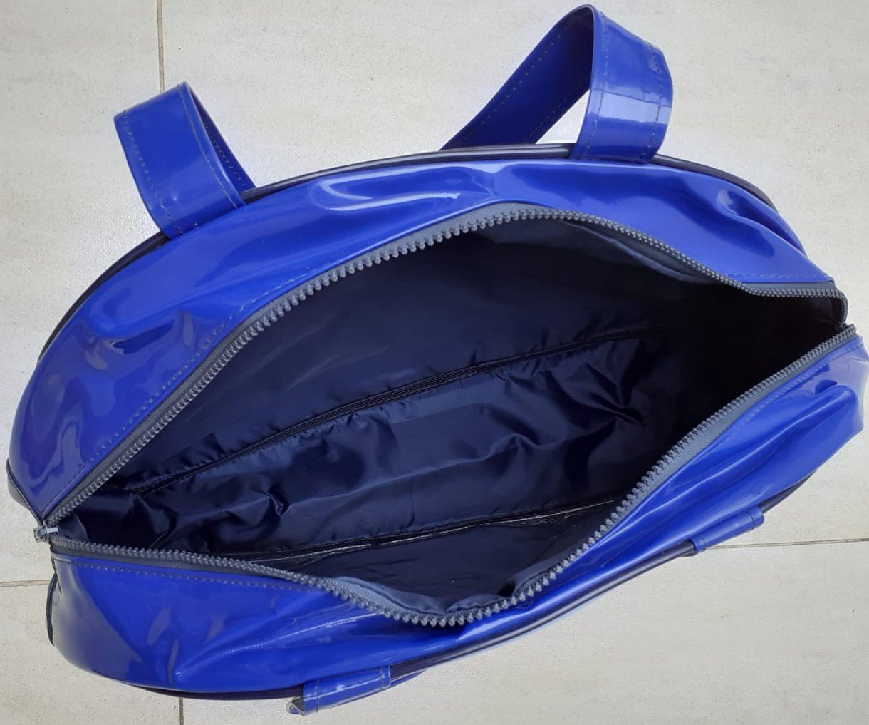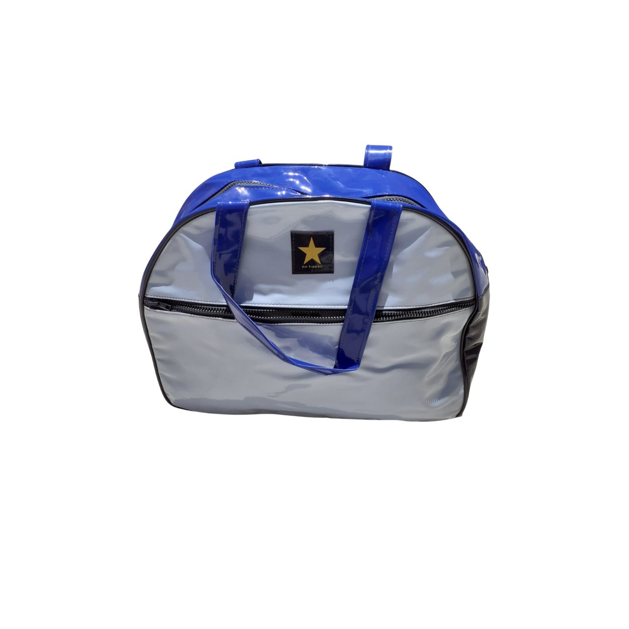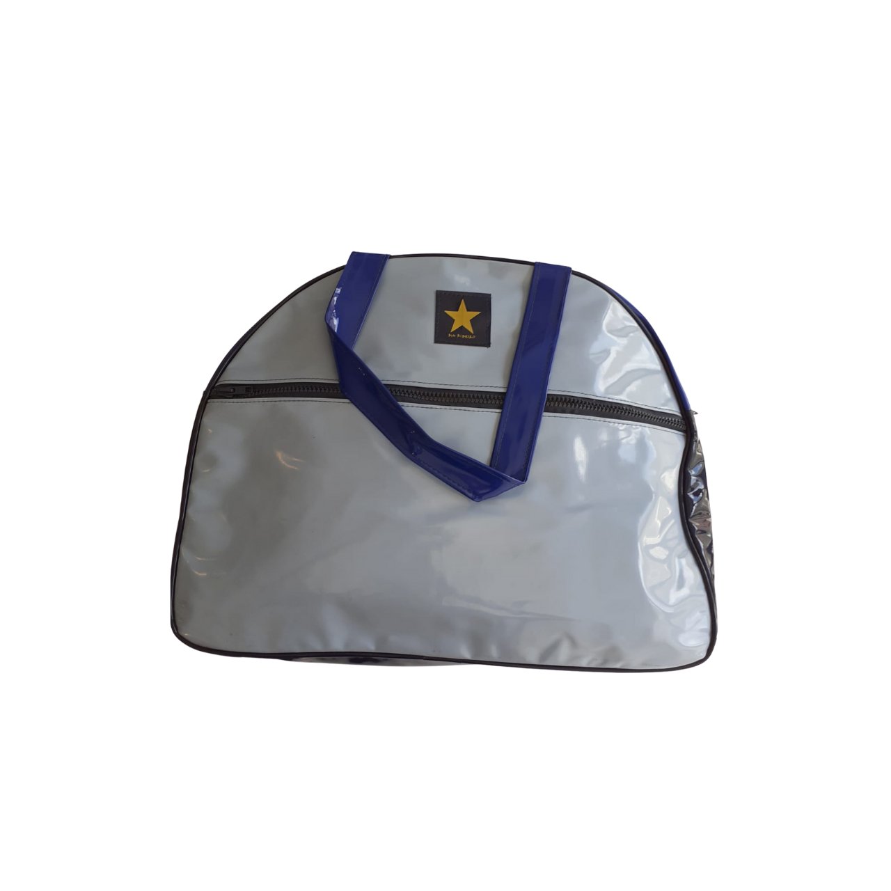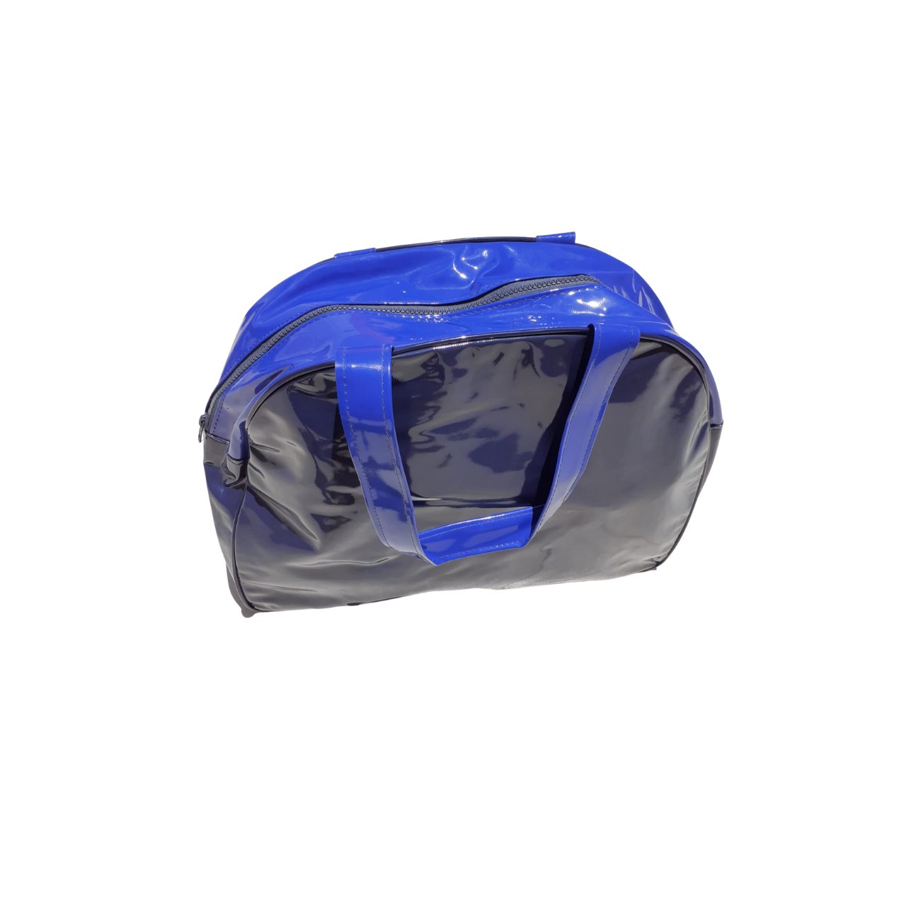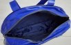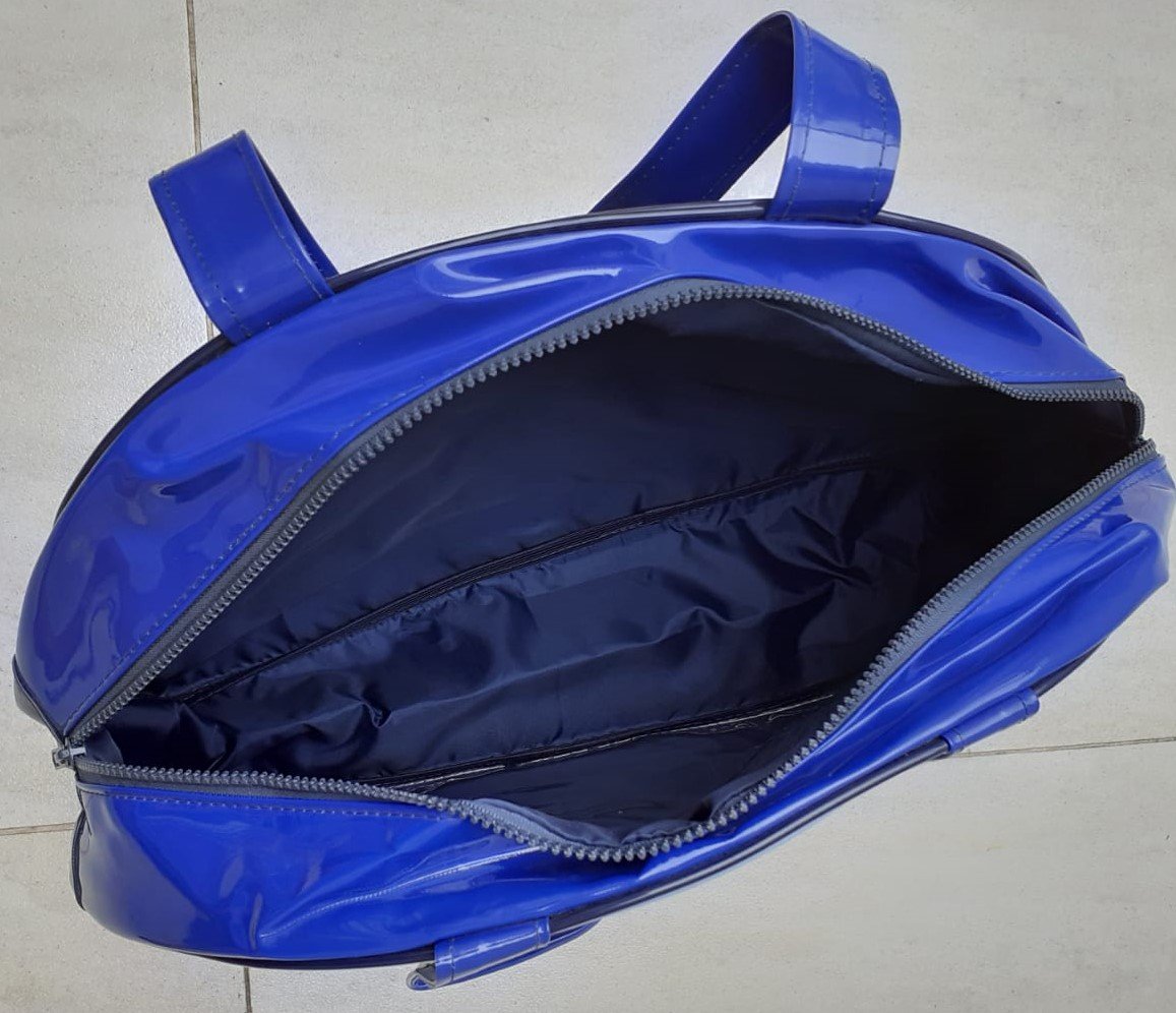 Bolsa azul de vinil com bolso frontal.
