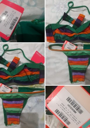 Lindo biquini fundo verde com listras coloridas. Soutian modelo tomara que caia com alça removível. Tamanho M Marca: Salinas