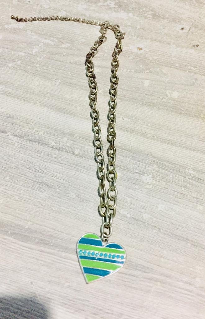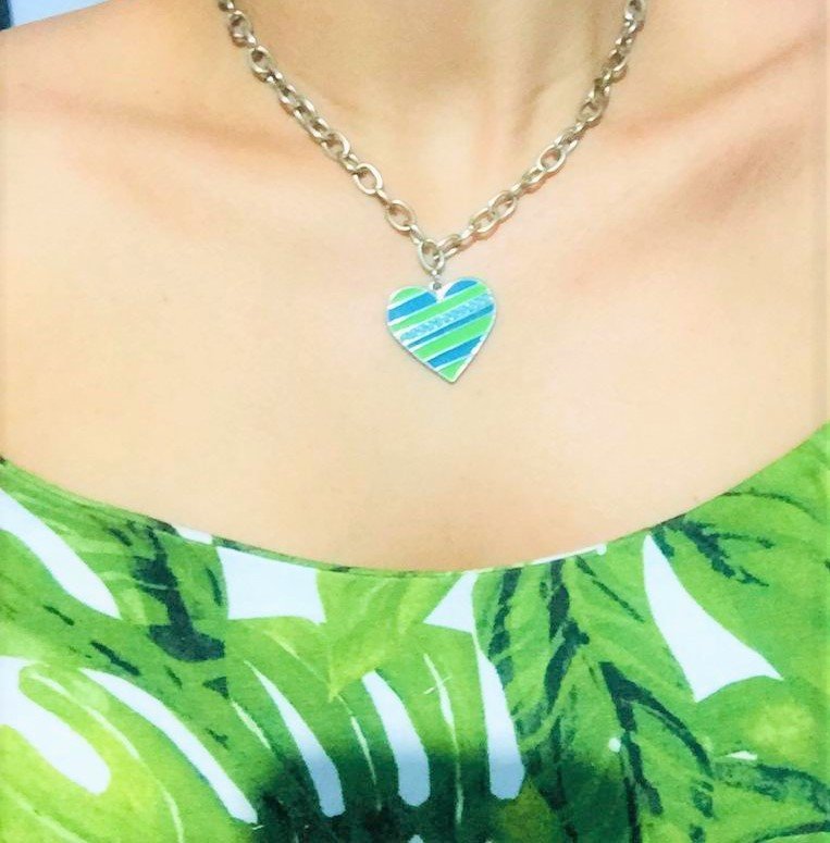 Colar de coração prateado revestido nas cores azul e verde.