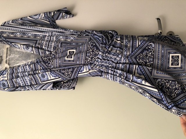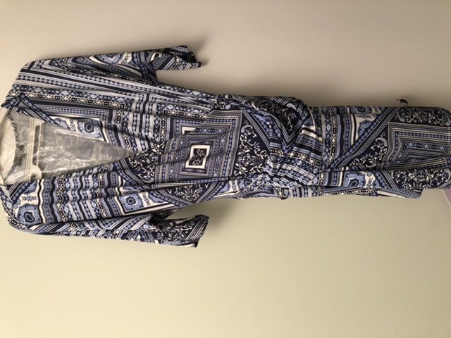 Vestido de malha fria, acinturado, manga 3/4, tamanho P, azul claro com azul escuro e branco. Usado pouquíssimas vezes! Perfeito! Maravilhoso