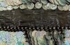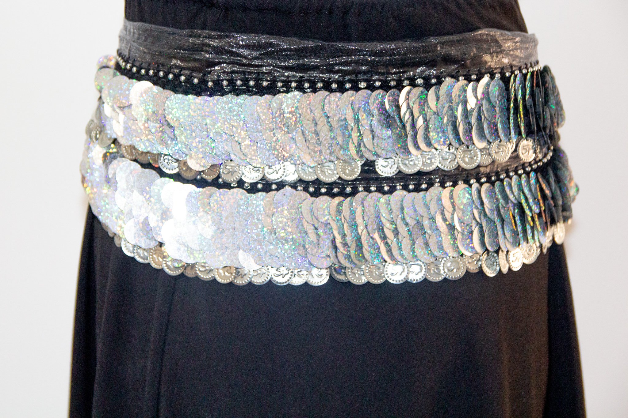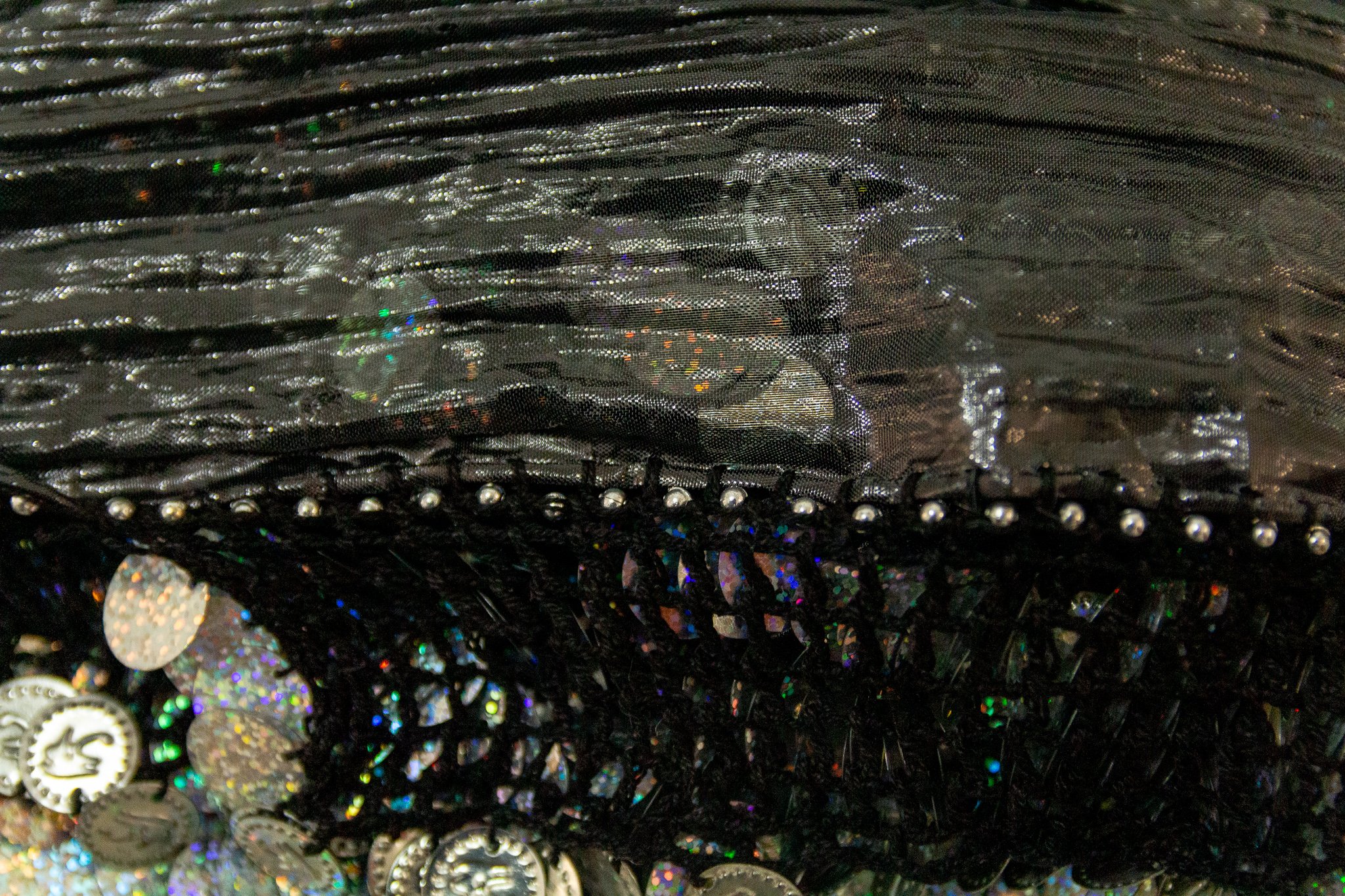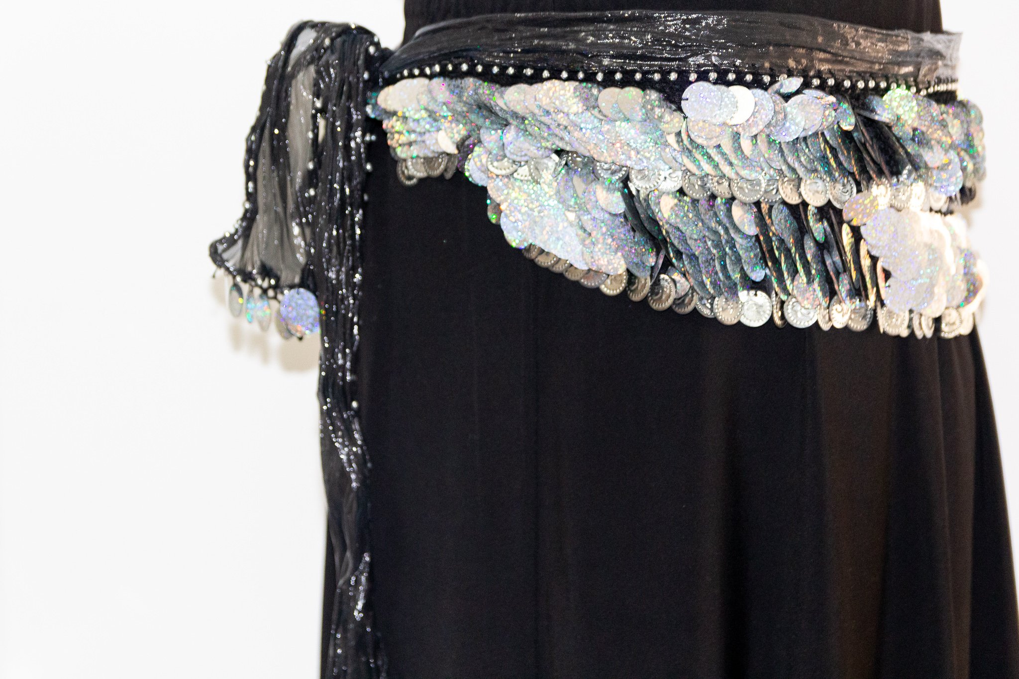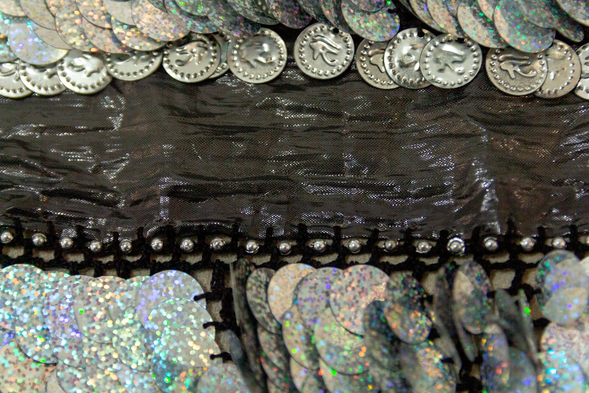 Lenço de quadril usado em excelente estado de conservação preto com pastilhas prata furta cor e moedas na cor prata. Origem: Egito.